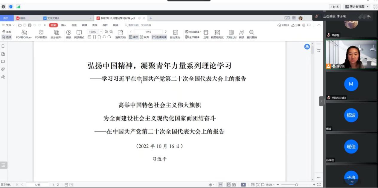 本次团日活动共包含学习解读,交流分享,总结收获三个环节,其间同学们认真思考、积极参与,活动基本取得预期效果。活动伊始,各班团支书带领同学们从过去五年的工作和新时代十年的伟大变革、开辟马克思主义中国化时代化新境界、新时代新征程中国共产党的使命任务以及各项重点工作内容等方面共同学习了党的二十大报告的主要内容。在交流分享环节,同学们结合学习材料内容展开了热烈的讨论。姜小丫(2020级本科生)表示,当代中国青年生逢其时,施展才干的舞台无比广阔,实现梦想的前景无比光明,青年人应该把学习作为首要任务,树立终身学习的观念,通过不断地学习来适应社会,坚定战略自信,保持战略清醒,增强信心斗志。欧阳肇鸿(2020级本科生)则从自身角度出发,表示将从自身做起,把讲政治落实在每一项工作中,坚定不移听党话、跟党走,并倡导当代同学们坚持不懈以习近平新时代中国特色社会主义思想武装自己,时刻牢记从现在起中国共产党的中心任务,切实增强政治认同感。最后,各班团支书结合讲话精神与日常的工作学习,归纳了同学们的发言,号召青年团员深入学习贯彻党的二十大精神,怀抱梦想又脚踏实地,敢想敢为又善作善成,在勤学善思中坚定理想信念,在知行合一中练就过硬本领。