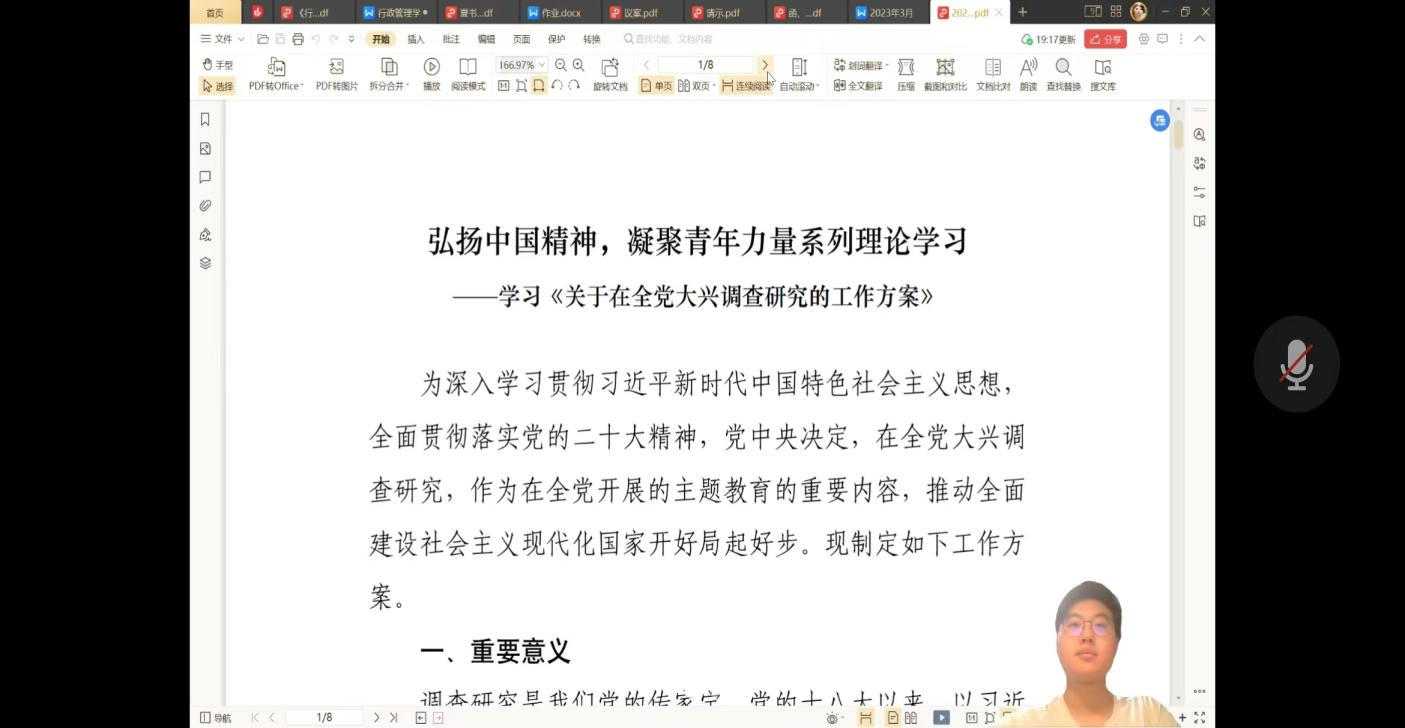 本次活动包含学习解读,交流分享,总结收获三个环节,其间同学们认真思考、积极参与,活动基本取得了理想效果。活动伊始,由各班团支书带领同学们共同研读学习了《关于在全党大兴调查研究的工作方案》,并深入阐述了毛泽东反对本本主义的理论框架,引领同学们进一步明悟大兴调查研究的总体要求与重要意义。在交流分享环节,同学们进行了自由交流,分享自己的学习认识与心得体会,李子荣(2020级本科生)围绕毛泽东反对本本主义的主要内容,指出反对本本主义的法宝在于大兴调查研究之风。应强调实践、批判形式主义和一切不良思想倾向,加强群众路线,恢复马克思主义普遍原理的权威性,使马克思主义适应中国具体情况。杨天硕(2020级本科生)则立足党的十八大以来改革发展环境,表示我国发展正面临新的战略机遇、新的战略任务与新的战略要求。国内改革发展稳定面临不少深层次矛盾躲不开、绕不过,各种风险挑战、困难问题比以往更加严峻复杂,唯有调查研究便是做出正确决策解决这些问题的正确前提。在本次团课活动的最后,同学们就本次学习内容进行了交流,踊跃分享了自己关于学习贯彻《关于在全党大兴调查研究的工作方案》的心得感悟,并表示将持续深入了解调查研究之法的实际效用与重要意义,通过对其方法手段的不断完善,推动对各地区、各部门、各领域的实际情况的深入了解与群众问题的科学处理,进一步实现维护人民群众利益,稳定国家发展大局。