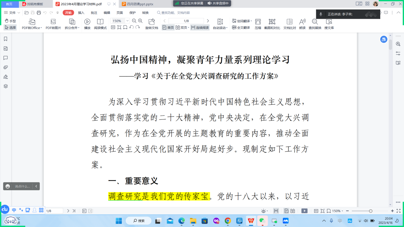 2023年3月,中共中央办公厅印发了《关于在全党大兴调查研究的工作方案》,并发出通知,要求各地区各部门结合实际认真贯彻落实。为认真学习方案内容,以习近平新时代中国特色社会主义思想武装头脑,全面贯彻落实党的二十大精神,极速赛车