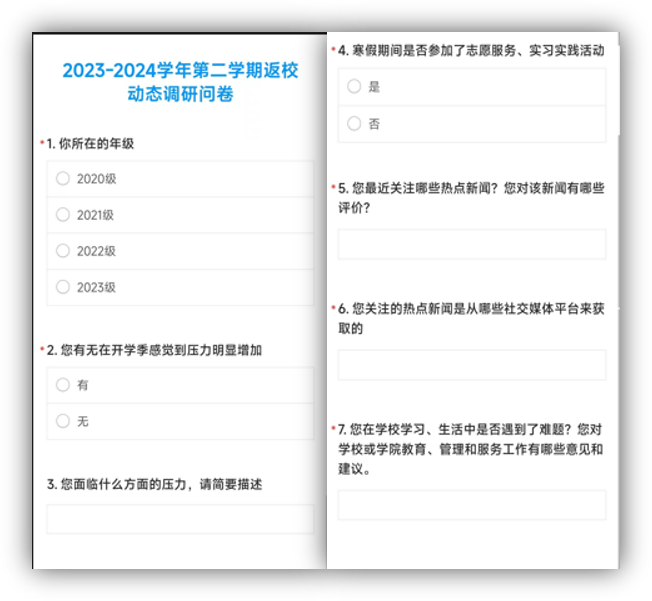在本科学生中发布思想动态调研问卷,结果显示,50.3%的学生表示在老师、家长的关照下情绪稳定、状态良好,学习生活等各方面并无压力;49.7%的学生表示目前面临压力,总结压力来源,与学生成长培养过程息息相关,低年级学生压力多数来源于开学调整、学业及日程生活压力;高年级学生压力多数来源于升学、就业及毕业论文等。同时,问卷显示,学生普遍关注全国两会、经济形势、国际关系、体育等时事内容,主要以抖音、微博、微信、B站和小红书为热点新闻获取平台。