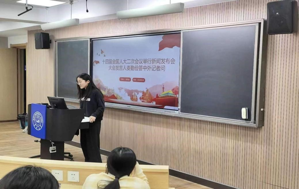 在视频引入环节,王楠(2023级本科生)引出了本次学习的中心即“十四届全国人大二次会议新闻发布会的中外记者问答”并展示相关视频。同学们紧跟主题学习会议精神并了解到,今年是中华人民共和国成立的75周年,是实现“十四五”规划目标任务的关键一年,也是全国人民代表大会成立 70 周年。第十四届全国人大二次会议大会以习近平新时代中国特色社会主义思想为指导,进一步把全国各族人民的思想和行动统一到党中央的决策部署上来。