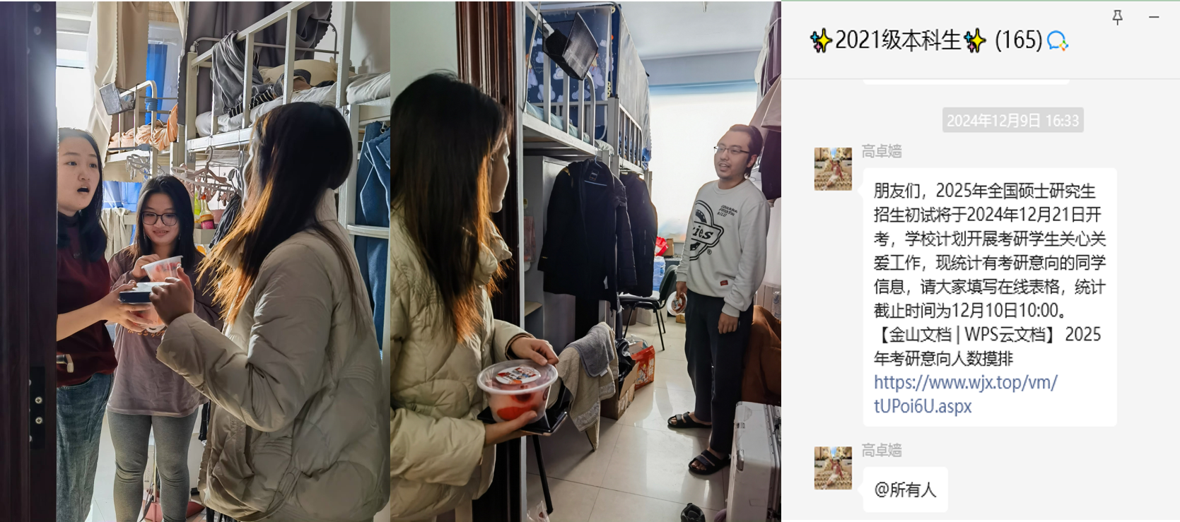 结合本科教育教学审核评估期间掌握到的历届毕业生毕业去向和动态,积极开展硕士研究生考试有关情况调查研究,逐一摸排学生就业意愿,详细了解研究生考试、报名和备考情况,帮助广大学生参加学业启航项目、明辨就业形势、落实毕业去向。毕业年级辅导员本院生源研究生结成帮扶对子,面向应届考生答疑解惑、分享经验。12月19日,辅导员深入毕业年级学生公寓,了解同学们的复习情况,给备考同学加油鼓劲儿,并送上爱心慰问品,排解考生焦虑情绪,鼓励学生从容自信应考。刚刚参加完研究生考试的应届生及往届生来到极速赛车