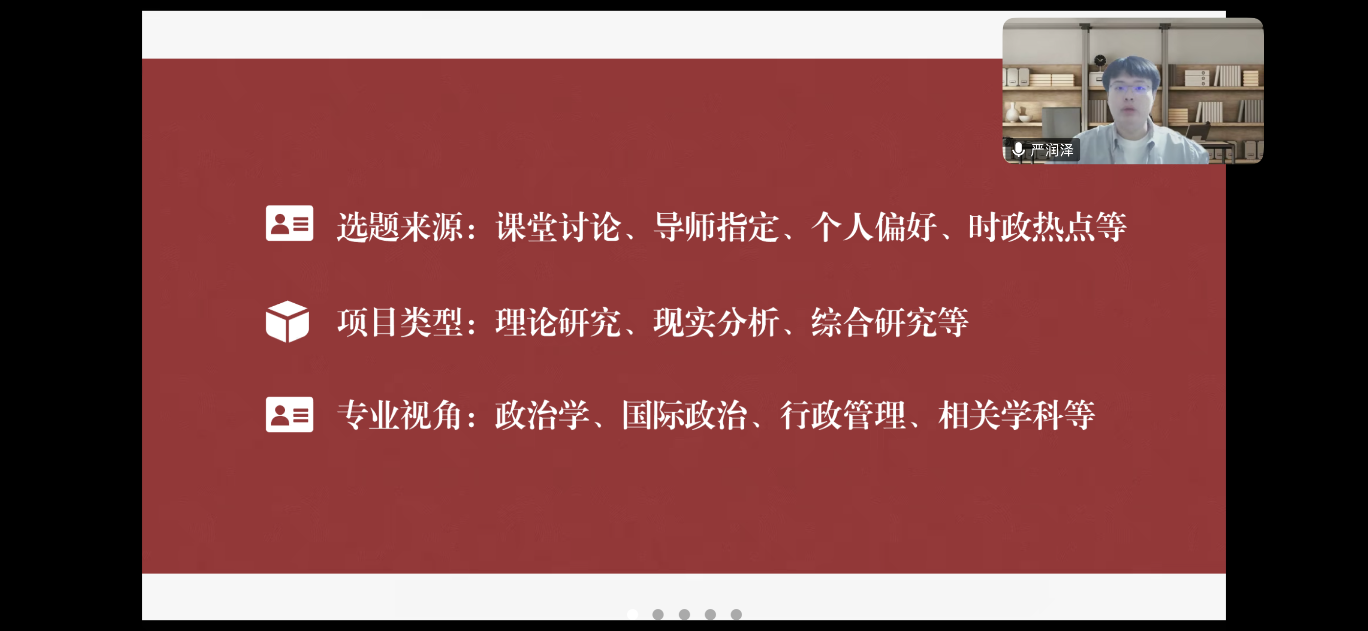 严润泽以“选题策略与实施要点”为题展开分享,强调选题需紧扣课堂研讨、导师建议及时政热点,注重研究深度与可行性,并推荐综合研究类项目以实现专业视角与现实问题的有机融合。严润泽认为,项目申报书需注重逻辑性与文质兼美,答辩环节应突出核心问题与前期积累,结题阶段则需完整呈现调研数据与成果,体现项目的实际价值与应用潜力。严润泽鼓励同学们将大创成果延伸至学术论文、竞赛或科研项目中,以过程体验驱动能力提升,而非单纯追求立项级别。