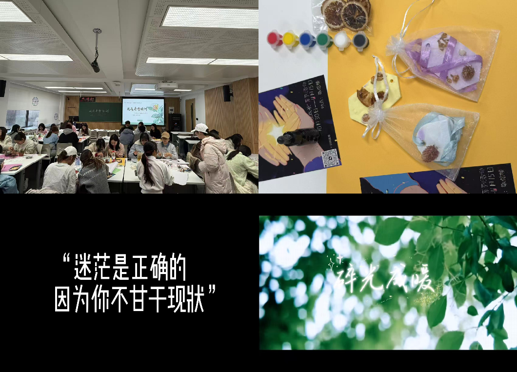 积极开展2025年“朋辈协力·心理成长”系列活动,分别举办“政苑疗愈绿洲——‘以劳健心’减压工作坊”和“镜见心途”——心理成长微电影创作”本研联合立项活动,将“以劳健心”理念融入心理健康教育,帮助同学们在繁忙的学习生活之外提供了一片休息的绿洲,切实提升了心理弹性与幸福感。同时,通过手工创作和微电影创作等方式,将心理健康教育与艺术创作相结合,为学生提供了一个情绪疏解和才华展示的平台,在深度协作中促进了朋辈联结,营造了关注心理、积极向上的良好氛围。