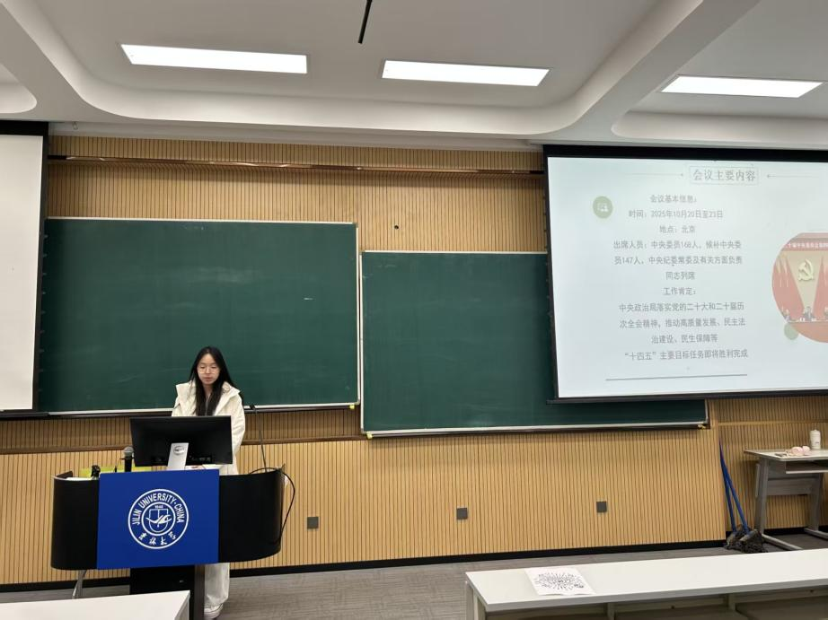 崔景琦同学(2023级本科生)结合全会公报,阐述了党的二十届四中全会以来中央政治局的工作成就,强调“十四五”时期我国经济实力、科技实力、综合国力跃上新台阶,中国式现代化迈出坚实步伐。通过这一环节,团员们深刻感受到作为共青团员的责任与担当,坚定了为基本实现社会主义现代化贡献青春力量的信念。