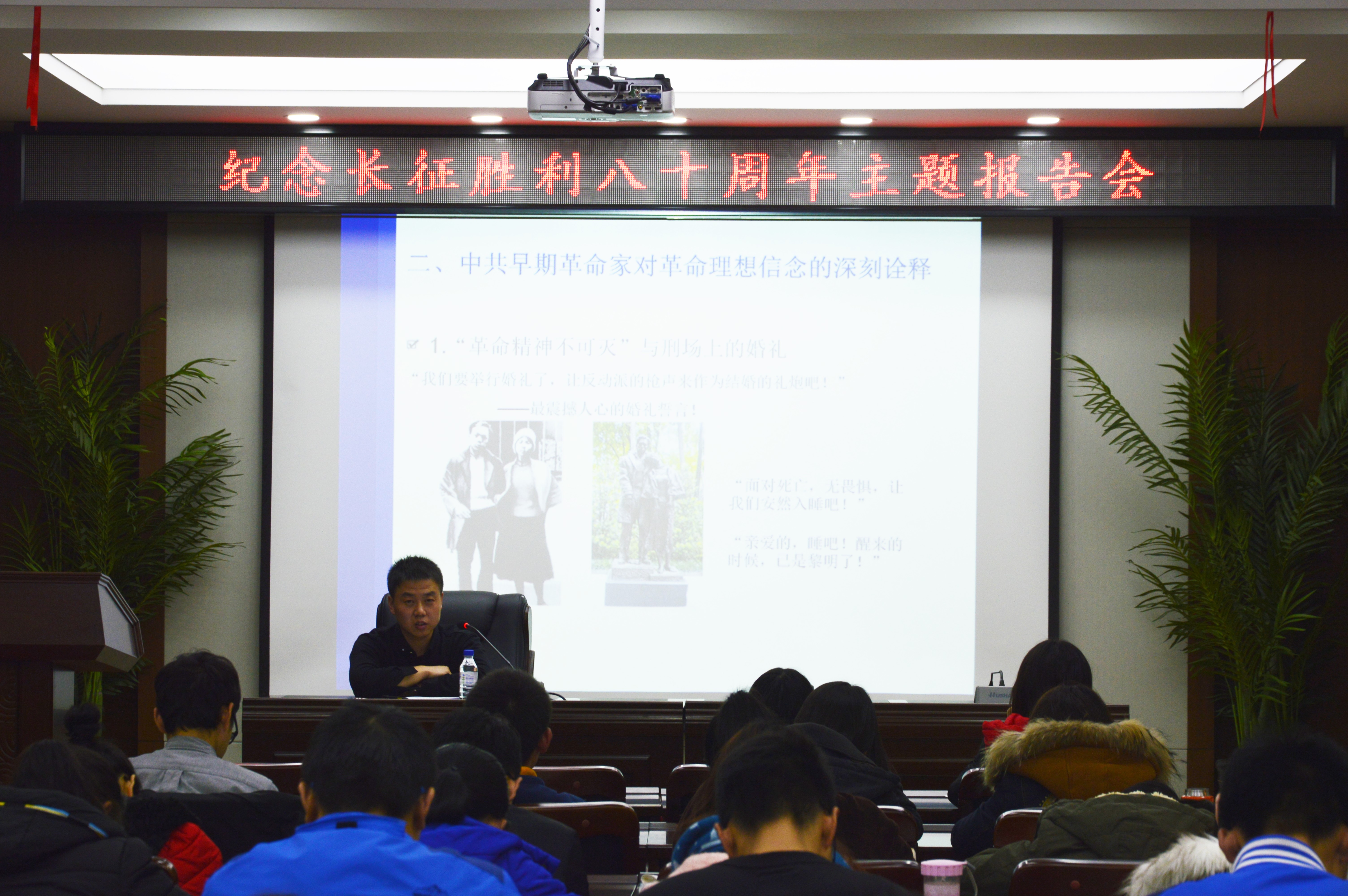 陈磊处长以“革命理想高于天”为主题,从多个方面为我们讲述了作为一名大学生,应该如何学习长征精神。他具体讲解了“革命理想高于天”是如何被提出来的,早期共产党员在实现革命理想的过程中是如何抛头颅洒热血的。