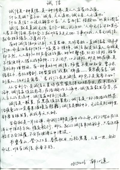 通过这次诚信格言(硬笔)比赛,使同学们接受了中华传统诚信文化的熏陶,帮助同学们树立了正确的人生观、价值观。同时,本次活动还号召学生们自我教育、自我完善和自觉加强诚信建设,牢固树立诚信为本、操守为重、守信光荣、失信可耻的信用意识和道德观念,从而促进学生们潜能的发挥,展现新时代优秀大学生的诚信形象。