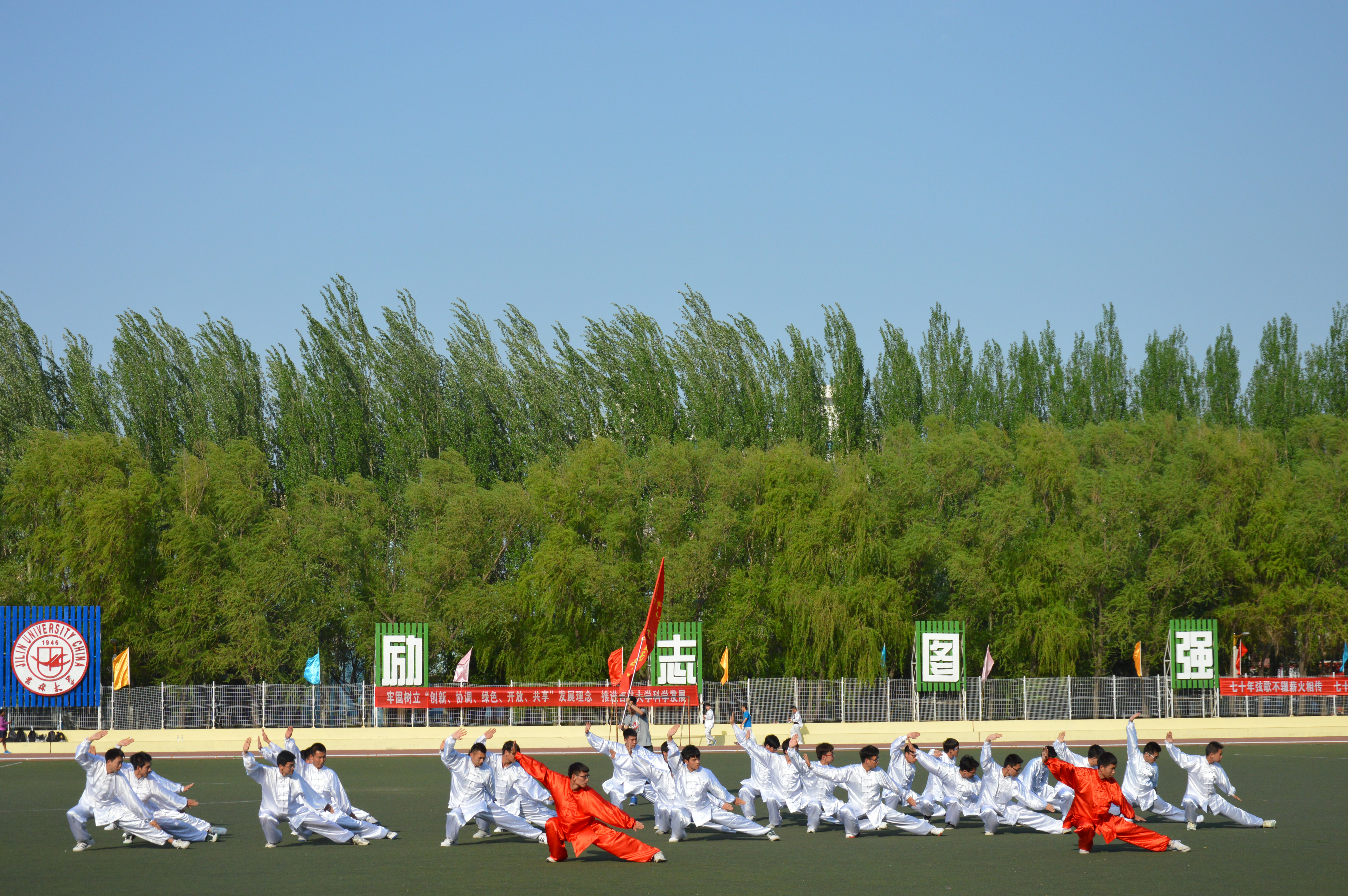 太极拳参赛队迈着整齐的步伐有序的进入田径场并开始了比赛。在李京原(2014级)的带领下,各参赛队员齐声高喊“天下为公,志在大同,文韬武略,问鼎苍穹”的口号有序地跑入田径场。在“敬礼”后,音乐声响起,在李京原的带领下,极速赛车