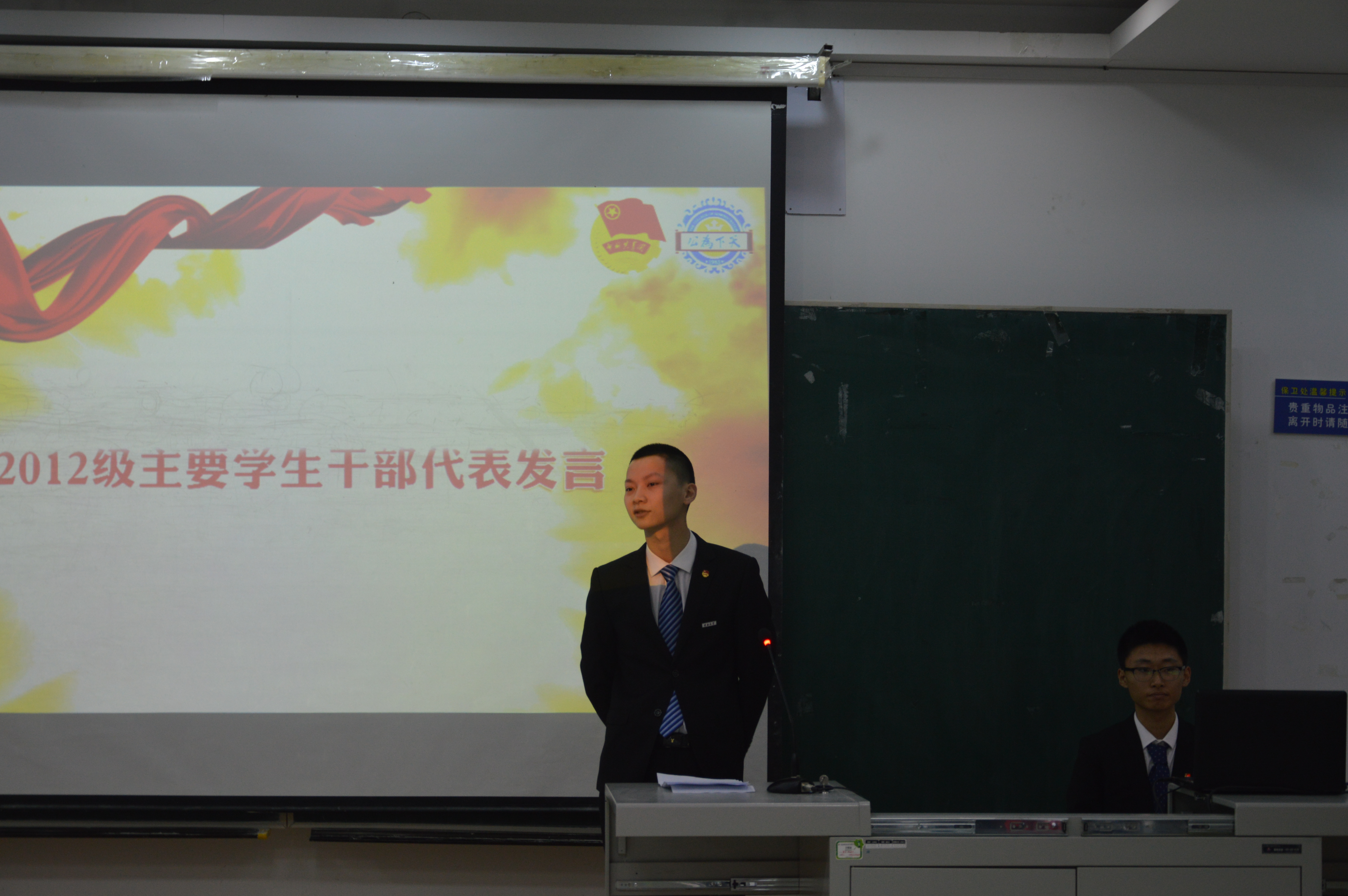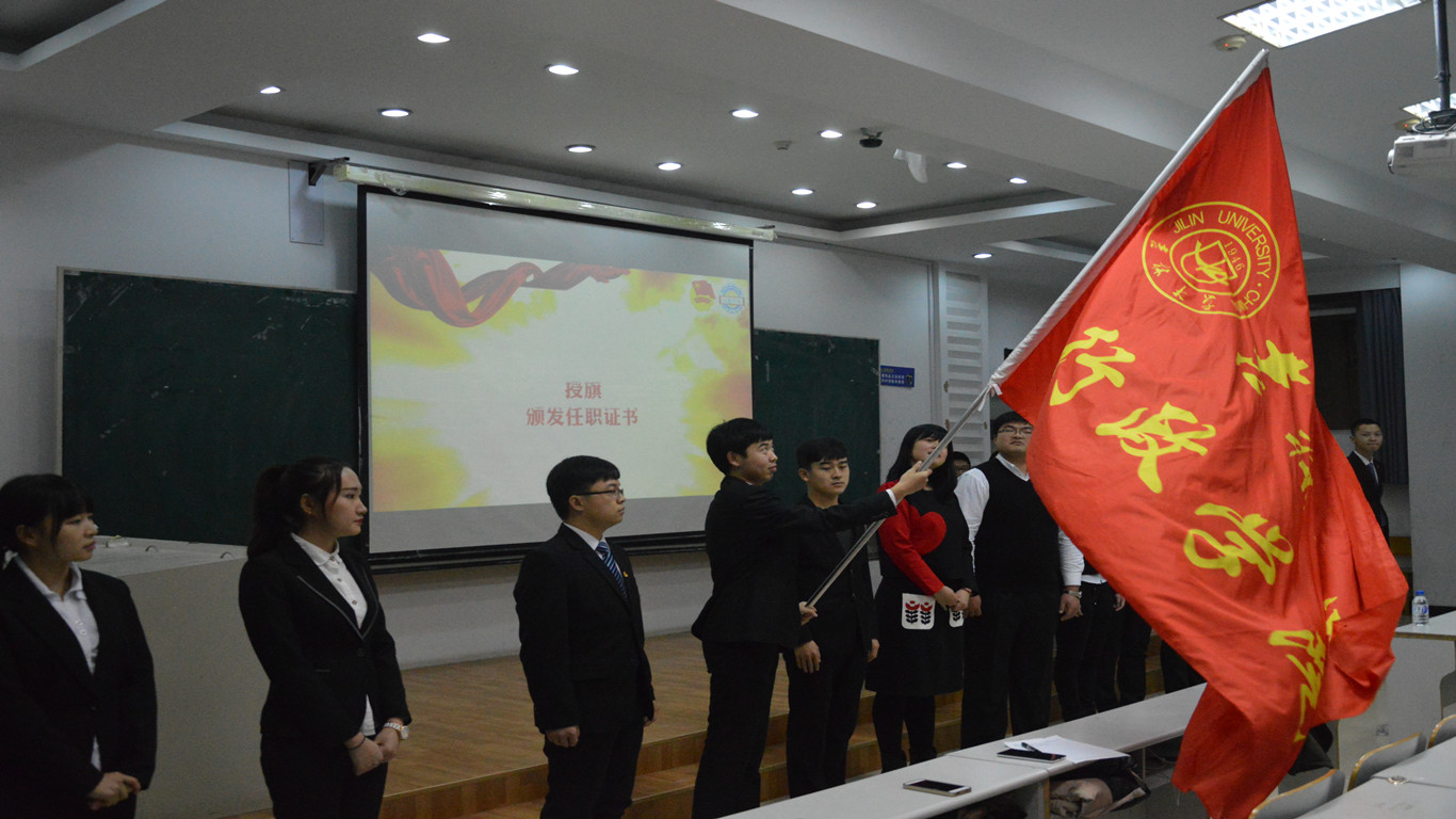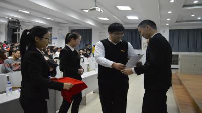的工作保驾护航。两位代表发言后,大会第四项随即开始。首先刘洋、曲畅竹与2012、2013级主要学生干部进行了本学年学生组织的授旗仪式;而后刘洋为2013级主要学生干部颁发任职证书,曲畅竹为院级优秀学生干部、单项奖学金获得者、2015级各班班委以及2014级极速赛车