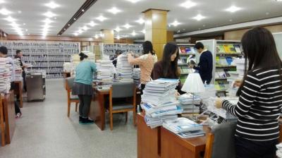 下午1时许,081503、081504班同学顺利到达长春市图书馆。3班主要负责旧书储藏室的清洁工作。在3班班长李克柔(2015级)进行短暂的分工后,同学们立即投入到了工作当中。女生们都小心翼翼地擦拭旧书,以避免旧书被沾湿受潮;男生们将一桶桶沉重的水提上楼后,便加入到了拖地的队伍中去。4班主要负责图书的整理工作。4班班长郑杰(2015级)针对工作的内容将班级同学分成了五个小组。其中,第一、二组主要负责期刊的初步整理,即把期刊按照月份的顺序下架、归类;第三、四组负责期刊的进一步整理,主要是将初步整理的期刊按照一定的顺序进行捆扎;第五组主要负责后期工作,收集已整理好的期刊并运送到指定的储存点。同学们配合默契、干劲儿十足,志愿服务工作提前完成,并获得图书馆负责人的好评。