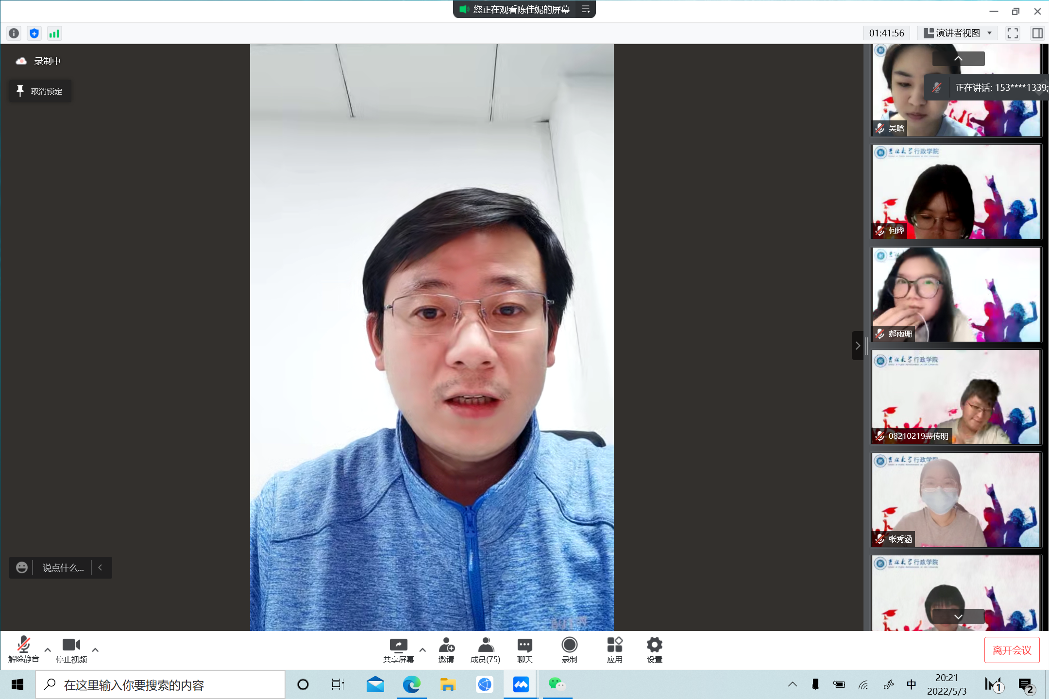 马景惠号召全院青年师生认真领会习近平总书记对于青年的谆谆教诲、不负党和人民寄语青年的殷切希望,以黄大年同志“振兴中华乃吾辈之责”的担当精神走好成长道路的每一步。一是要坚定理想信念,树立的远大理想,坚定不移听党话、跟党走;二是要努力提升综合素质,通过课堂学习掌握书本理论知识、通过社会实践练就过硬本领,矢志成为有能力参与国家复兴大业的建设者和接班人;三是要树立正确的人生观和价值观,继承和发扬中华民族德传统美德,学习和践行社会主义核心价值观;四是坚持开拓创新,解放思想、求真务实,通过创新创造积累人生阅历和成长经验,丰富多彩青春。