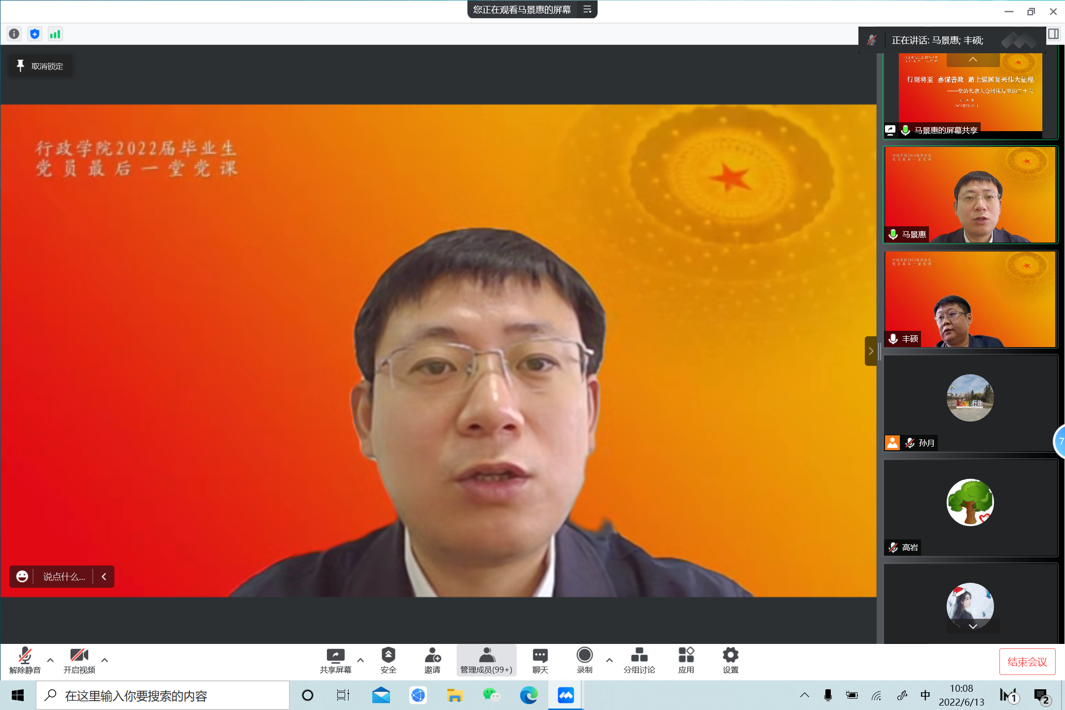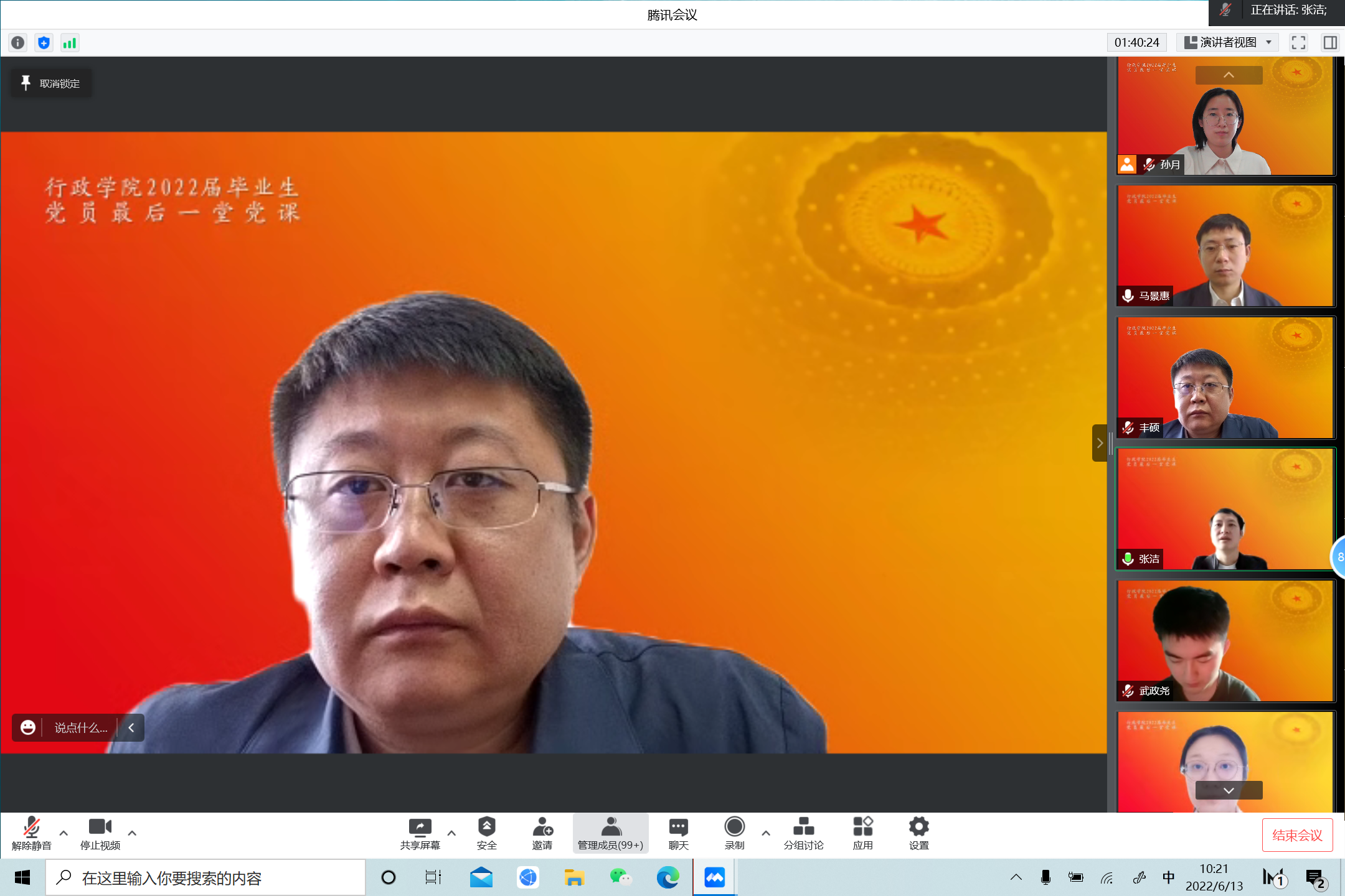 党课最后,马景惠寄语毕业生党员在未来岗位上履职尽责,发挥党员先锋模范作用,在实现党的第二个百年奋斗目标新征程上奋发精进,勇毅前行。马景惠再次向全体毕业生表达美好的临别祝福,与会人员在线上亲切同框合影留念。