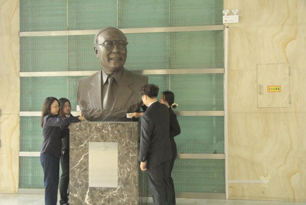 观看完毕,师生代表前往王惠岩先生雕像处。学生代表景冉、陈佳妮、王上华、张航仔细擦拭了王惠岩先生雕像,拂去尘灰。其余师生代表依次向雕像敬献鲜花。全体师生代表默哀三分钟以表哀思。