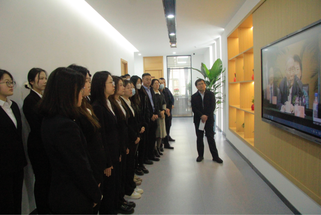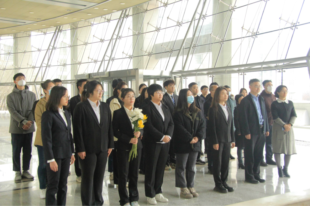 师生代表于东荣大厦开展清明祭扫活动,季洪涛引导师生代表观看王惠岩先生专题纪录片《惠人育才,志如坚岩》并带头回顾王惠岩先生生平事迹,师生代表肃立观看视频,皆为先生的事迹动容。