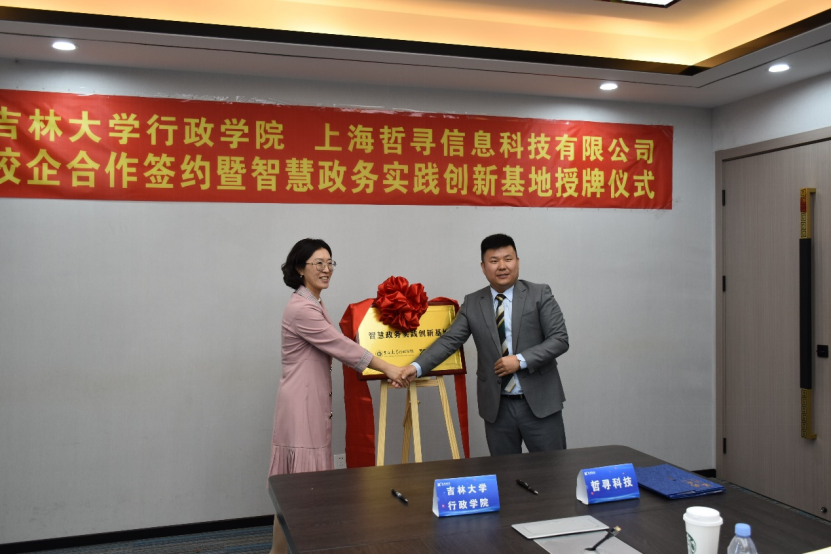 随后,徐坤副总经理对公共管理实验教学建设成果进行了汇报,并对哲寻科技的相关软件进行实操演示。汇报结束后,全体人员对校企共建“智慧政务实践创新基地”相关事宜进行交流和讨论,双方进行了深度的交流洽谈,并达成了明确的合作意向。双方以共建“智慧政务实践创新基地”的形式共同进行人才培养和实习实践工作,并签订了校企共建实践合作基地协议书。史慕华副书记与尹朝辉总经理共同为“智慧政务实践创新基地”揭牌。