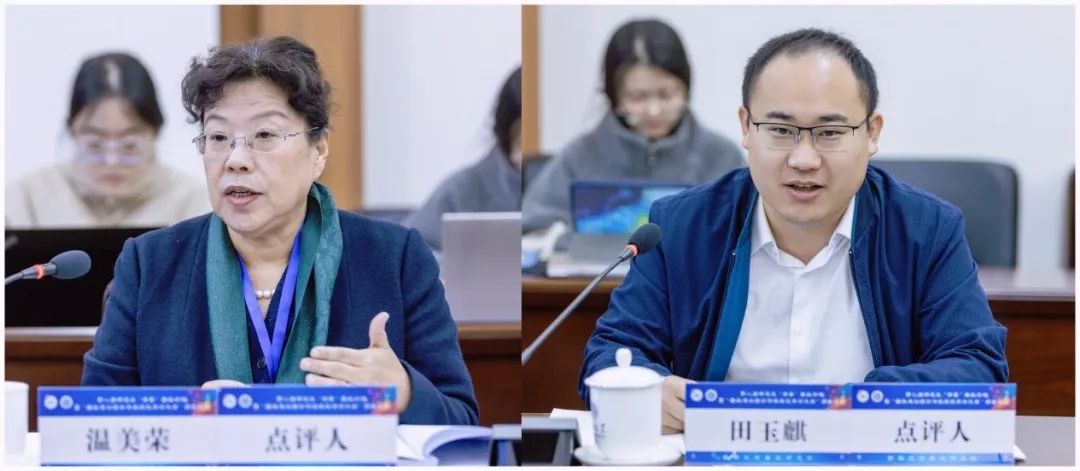 吴蕾作精彩发言。点评环节,温美荣老师和田玉麒老师充分肯定同学们的研究成果,并分别从论文选题、关键词、文章用词等多角度深入细致地提出完善方向。