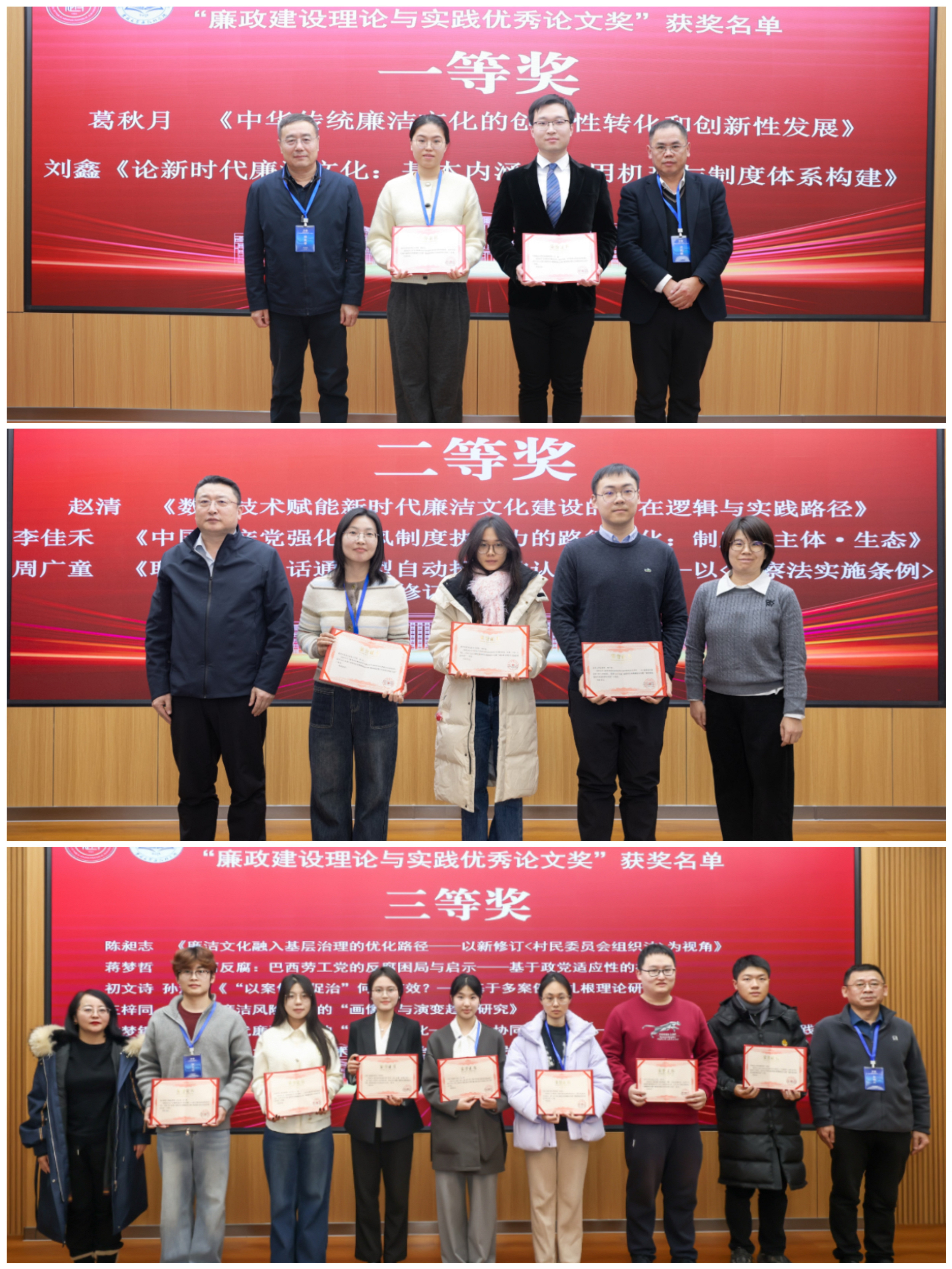 廉政研究院副院长郑倩副教授宣布评奖流程与获奖名单。本次评奖严格遵循回避制度与全过程双盲评审制,经过“论文征集 — 自主申报 — 资格审查 — 通讯评审 — 专家会评”等规范流程,最终评选出“廉政建设理论与实践优秀论文奖”11篇,其中一等奖2篇、二等奖3篇、三等奖6篇。袁柏顺教授、柏维春教授,李红权教授、杜晓燕教授、吕红娟负责人、朱明仕教授分别为获奖者颁奖。