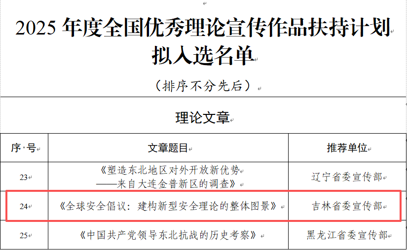 2026年1月19日,中央宣传部办公厅、广电总局办公厅公布了关于2025年度全国优秀理论宣传作品扶持计划入选名单,极速赛车 刘雪莲教授的《全球安全倡议:建构新型安全理论的整体图景》一文成功入选。此次入选的理论文章共50篇,刘雪莲教授的文章由吉林省委宣传部推荐。《全球安全倡议:建构新型安全理论的整体图景》一文于2025年8月26日发表在《人民日报》理论版,是“深入学习贯彻习近平新时代中国特色社会主义思想原创性概念标识性概念纵横谈”的系列文章之一,文章发表后,得到了社会和学界很好的反响,不仅有南方网、中国经济网等多个网络平台转发,而且被《新华文摘》2025年第21期全文转载。此次入选2025年度全国优秀理论宣传作品扶持计划,是对这篇文章的再次肯定。