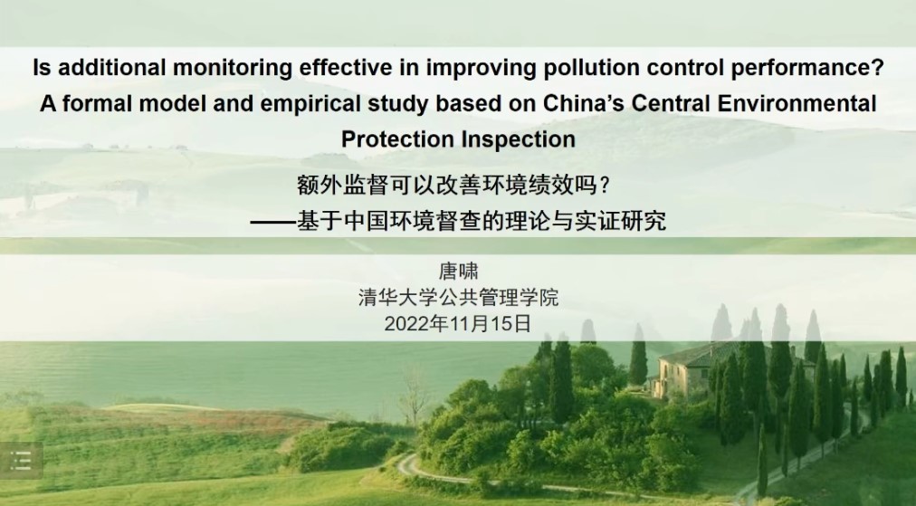 副教授、清华大学国情研究院副研究员、清华大学仲英青年学者、首届夏书章公共管理优秀博士论文奖获得者唐啸老师受邀担任主讲嘉宾,作题为“额外监督可以改善环境绩效吗?——基于中国环境督查的理论与实证研究”的学术讲演。本次讲座由极速赛车