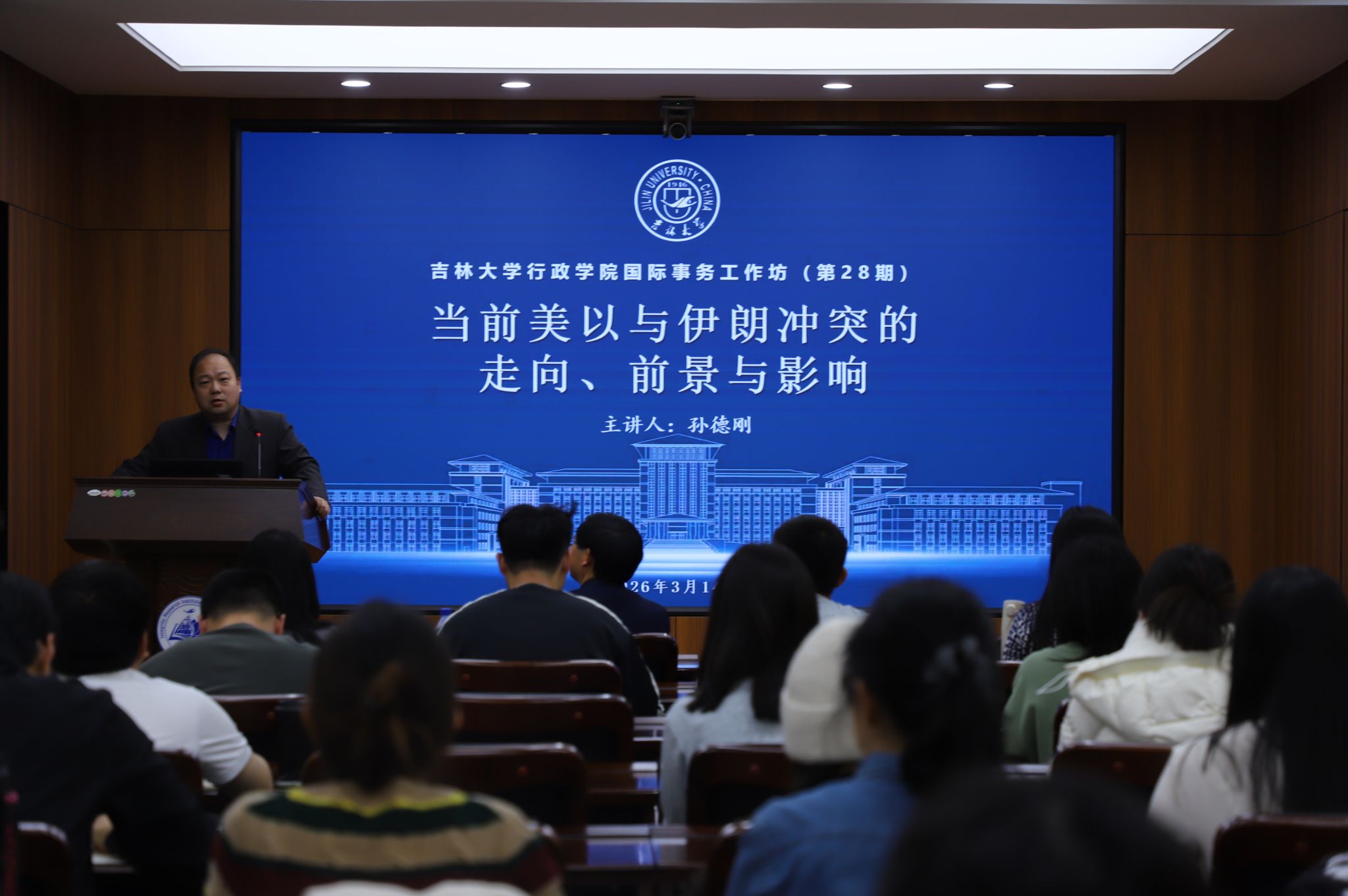 2026年3月14日,极速赛车 国际事务工作坊(第28期)学术讲座,在前卫南区东荣大厦B303会议室举办。本期工作坊邀请复旦大学国际问题研究院院长助理、中东研究中心主任孙德刚教授担任主讲嘉宾,作题为《当前美以与伊朗冲突的走向、前景与影响》的学术报告。本次活动由极速赛车 学术委员会主任委员、国际政治系主任郭锐教授主持,极速赛车 50余名师生参与讲座。