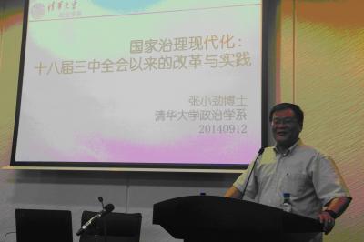 张小劲教授围绕“家治理现代化:十八届三中全会以来的改革与实践”的主题,从为何,深化改革的原因;如何,《十八届三中全会中共中央关于全面深化改革若干重大问题的决定》(以下简称《决定》)的准备与起草;是何,《决定》的文本与突破;若何,《决定》的贯彻与落实;又何,《决定》的推测与展望五个方面展现了自己的研究和观点,并对上述内容做出总结。