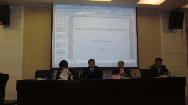 王生教授在会上宣讲了《亚太安全环境新变化与中韩战略合作的意义》的论文。他的论文从对亚太全局、中国的周边外交战略、韩国的外交多元化走向等三个方面剖析了中韩战略合作的重大现实意义。王生教授认为,中韩战略合作的加深会大大改变亚太地区的地缘政治格局,过去的美日韩架构逐渐被美中韩新三角所取代,有效遏制美日韩同盟体系内“恶”的作用的涌动,从而增加引导亚太地区“和平阵营的正能量的发挥”。对韩国来讲,加强中韩战略合作,使得美韩同盟、中韩战略伙伴关系趋于平衡发展,韩国的外交会趋向多元化发展,拓展了韩国的战略空间与回旋余地。同时可以防止韩国加入美国在中国周边构筑的以遏制中国的亚洲版“小北约”的情况发生。中韩战略合作的加深,也会使美韩军事同盟有所松动,减轻朝鲜方面的战略压力,会对南北关系的发展起到积极的促进作用。