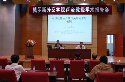 卢金教授在报告中首先阐述了“中俄战略协作伙伴关系”的重要意义;并指出中俄间的“伙伴关系”并非同盟,也不针对任何特定国家;在这个背景下,当前中国与俄罗斯关系保持了友好发展的趋势。随后,卢金教授对近代以来的中俄关系进行了一个简要的梳理和分析,提出当前的中俄关系是历史上第一次平等的双边关系。他认为,中俄战略协作伙伴关系有着坚实的现实基础,两国相互依赖日益加深,双边关系不断密切、深化;中国需要俄罗斯,俄罗斯同样需要中国。卢金教授指出,当前,中国与俄罗斯贸易往来不断扩大、双边多渠道的交往持续加深;两国在经济合作领域获得了迅速、深入的发展。与此同时,中国与俄罗斯还建立了规范的双边关系工作机制,民间来往也不断加深,中国“俄罗斯年”的影响也越来越大,中俄关系在多个领域内都取得了可喜的成就。卢金教授在讲座的最后特别强调,在新的时期,面对全球经济以及世界局势的各种复杂问题,中俄双方更应该增强政治互信,加强经济合作,力促文化交往,把中俄关系推向一个新的更高的台阶。