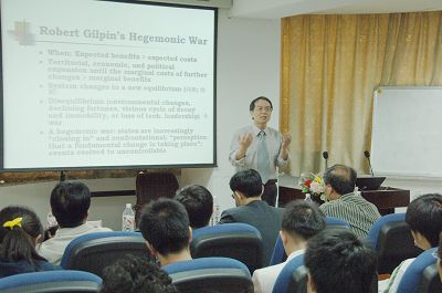 李伟钦教授首先介绍了国际政治分析的三种理论框架。李教授认为国际政治体系和霸权国家更替都是有规律的,呈现了“霸权强势——霸权削弱——国际势力分化——世界战争——霸权强势”这样的一个周期性的历史循环过程。在周期性历史循环过程中,最初处于霸主地位的国家,它在国际政治体系中承担着维持既定的国际秩序、保护其盟国利益的责任,但是,由于长时期承担国际事务的负担,必然导致本国国内发展受到影响,国内发展减慢;与此同时,一些潜在的国家会迅速的壮大,与霸权国家的差距逐渐缩小,从而导致国际体系失衡,这表现在霸权国霸主地位消失,世界体系由单极体系进入多极体系,进而国际社会陷入无政府主义和战争状态。最终,以新的霸权国产生并结束世界战争状况,并建立新的国际体系。李教授指出,后崛起的国家必然会对霸权国的地位进行挑战,并威胁到既定的国际政治体系,在这种情况下,往往会出现两种结果:一种是战争,一种是和平过渡,而这往往取决于挑战国和霸权国双方的态度,以及双方对既定秩序的满意程度。接着,李教授分析了中国之崛起。李教授认为中国经过改革开放30年以来的发展,经济、政治、军事和外交实力都在迅速增长,至于中国会不会对当今美国的霸主地位进行挑战,持有自由主义、悲观主义和构建主义的学者对此有各自不同的看法。他认为,虽然中国综合国力在世界排名有所提升,但是,中国国内现在也面临着人口过多、能源消耗、地区失衡、政治体制滞后、环境恶化等诸多的问题亟需解决,而中国当前更愿意选择对话、合作和和平的方式来解决国际上的争端,而不是付诸武力,因此,中国的崛起不会给世界秩序带来威胁。最后,李教授精彩的回答了同学们的提问。