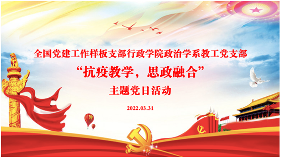 关于开展课前五分钟抗疫精神课程思政的相关要求,进一步保证疫情防控期间线上教学质量,2022年3月31日,政治学系教工党支部开展“抗疫教学,思政融合”主题党日活动。政治学系全体教师参加会议,支部书记刘畅主持会议。