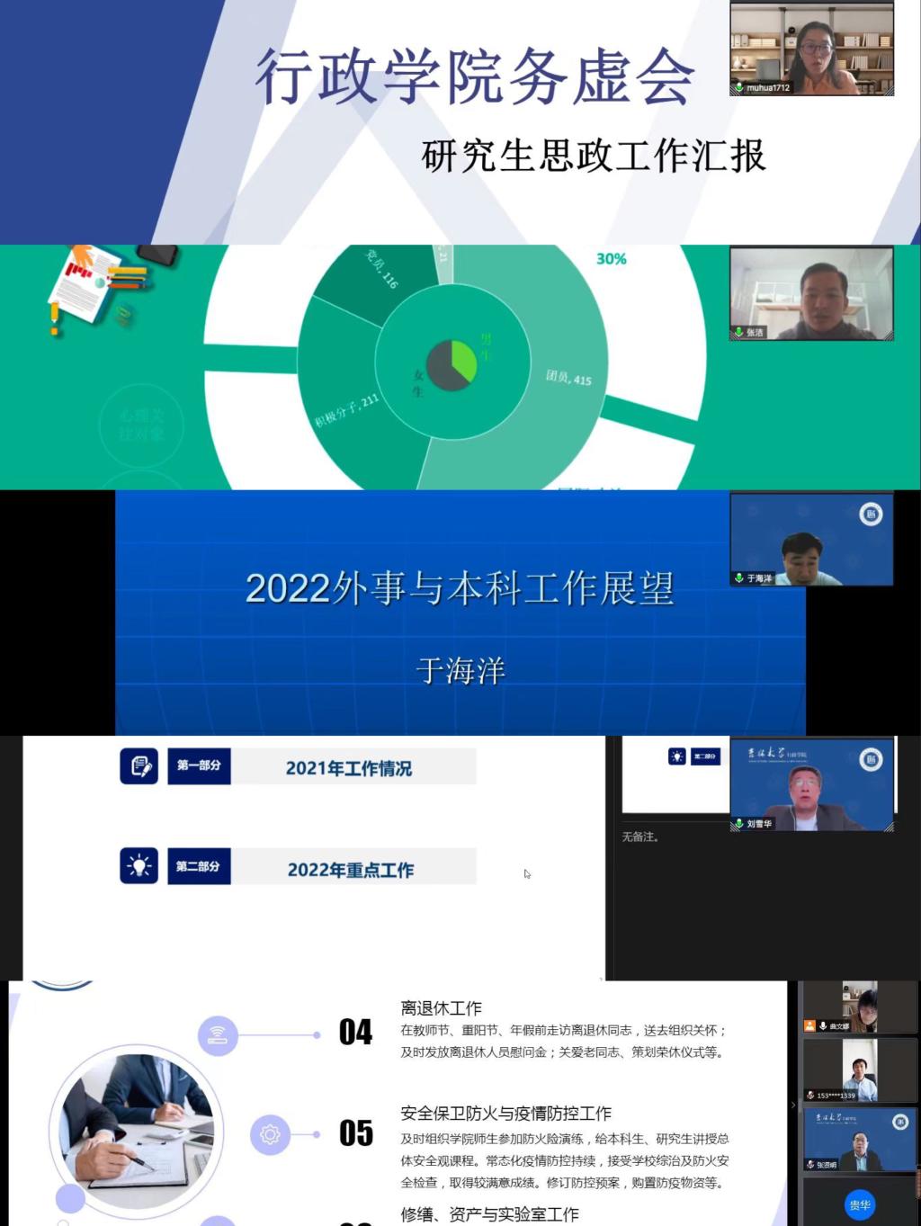 年度工作进行系统梳理,并着重强调了五方面的重点工作:一是优化师资队伍结构,提升师资队伍整体水平;二是围绕立德树人根本任务,着力提高本硕博人才培养质量;三是积极培育标志性成果,增强学科发展硬实力;四是扩大对外交流合作,强化学术成果宣介,提高学科建设软实力;五是促进党建与业务深度融合,把好学科发展方向,夯实学科发展基础。
