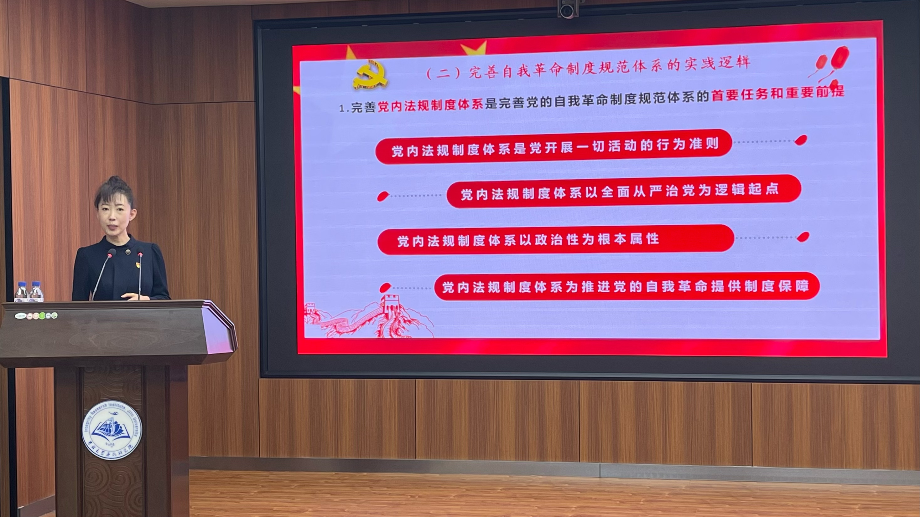 刘畅以《深入学习贯彻党的自我革命精神 淬炼新时代高校大学生廉洁品格》为题,结合刚刚参加的全国高校教师党支部书记“双带头人”高级研修班培训心得体会,旁征博引,深入浅出,为学员们呈现了一堂集知识性、哲理性、政治性为一体的党课。刘畅从历史沿革和时代要求的维度详细介绍党的自我革命的发展演进和表现形式,讲解了习近平总书记关于党的自我革命的重要战略思想,明确了新时代大学生廉洁自律的规范要求,帮助大家找到淬炼廉洁品格的着力点。刘畅剖析破解治乱兴衰历史周期律“两个答案”的辩证关系,阐明党的自我革命与社会革命的相互影响,勉励广大青年学生笃行进取、遵纪守法、勤俭节约、正直自信,在积极向党组织靠拢的过程中不断增强自我净化、自我完善、自我革新、自我提高的意识和能力。整节党课既有深刻的理论分析,也有精彩的问答互动,课堂氛围轻松融洽,学员们在听讲中聚精会神,意犹未尽。