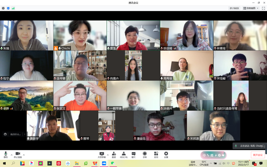 317日,刘雪莲老师带领18名学生开展线上讨论。刘老师首先对同学们的生活和身心健康表达了关心,叮嘱大家要好好防护,保持乐观心态。在接下来的讨论中,各位同学针对本学期的学习计划进行汇报,每一位同学展露出良好的精神状态以及积极的学习态度,令老师十分动容。最后,刘老师动情说到,“特殊时期,你们都能乐观面对,懂得感恩,并且积极向上,努力学习,你们都是老师的骄傲!期待春天到来时,我们可以在线下有更好的相遇!”