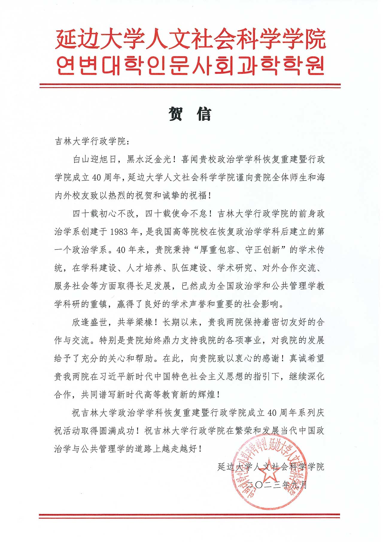 延边大学人文社会科学学院的贺信