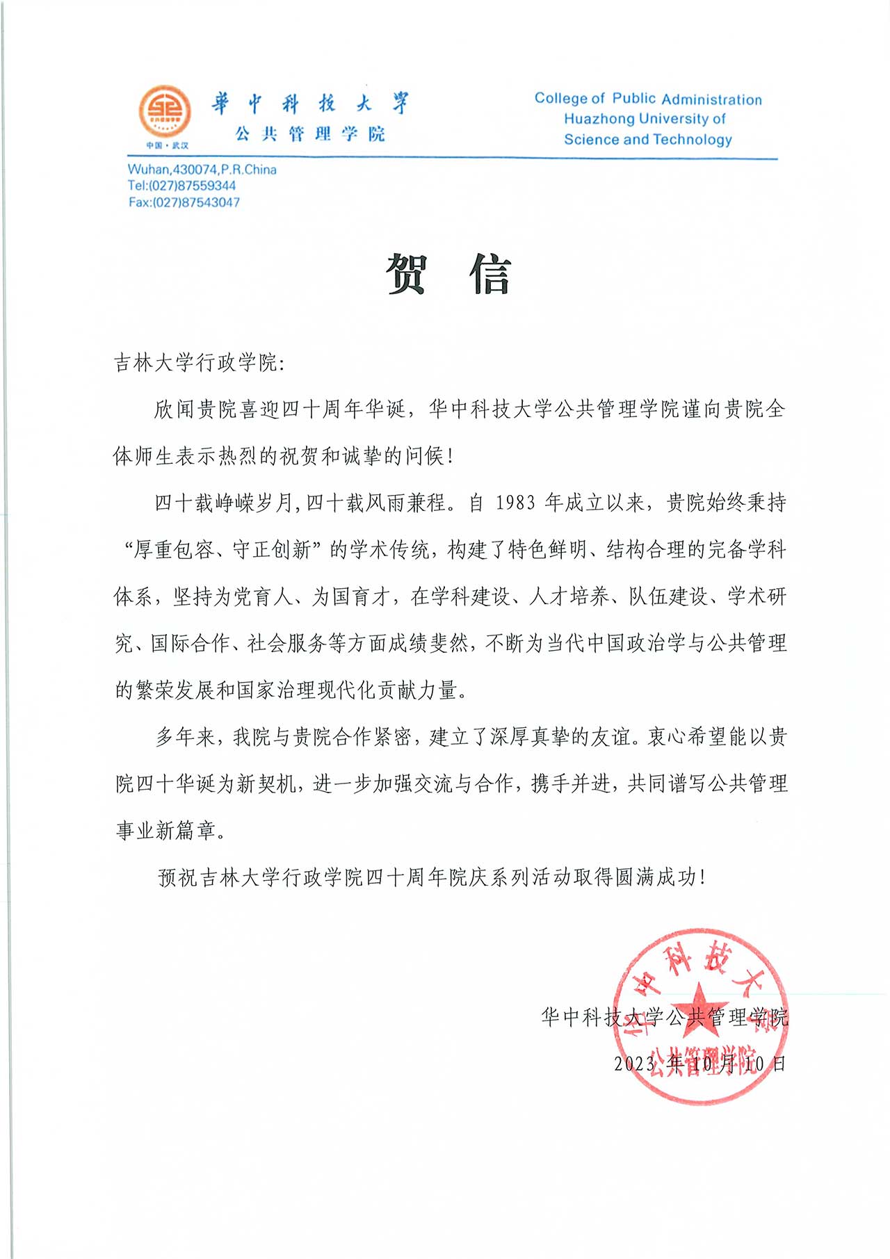华中科技大学公共管理学院的贺信