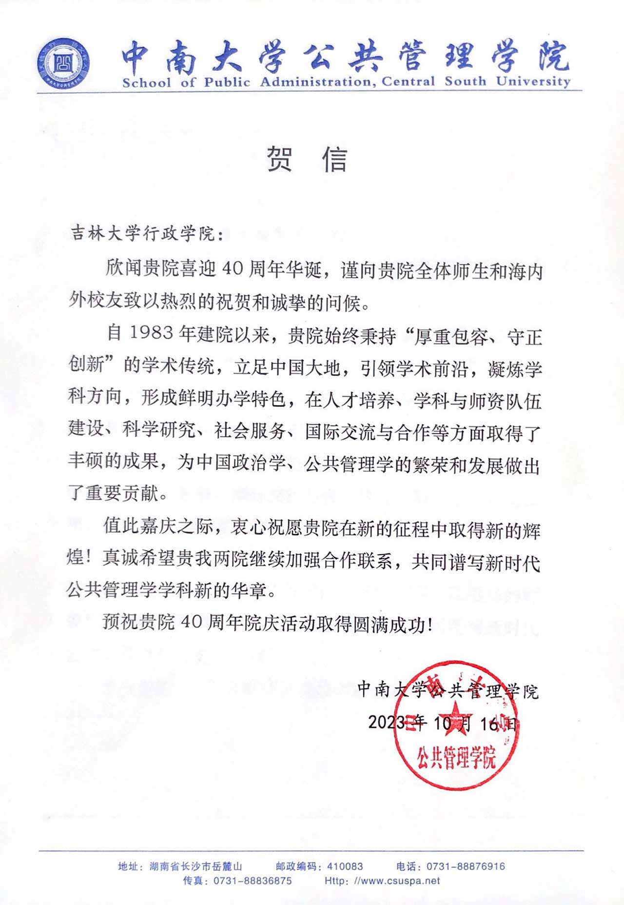 中南大学公共管理学院的贺信